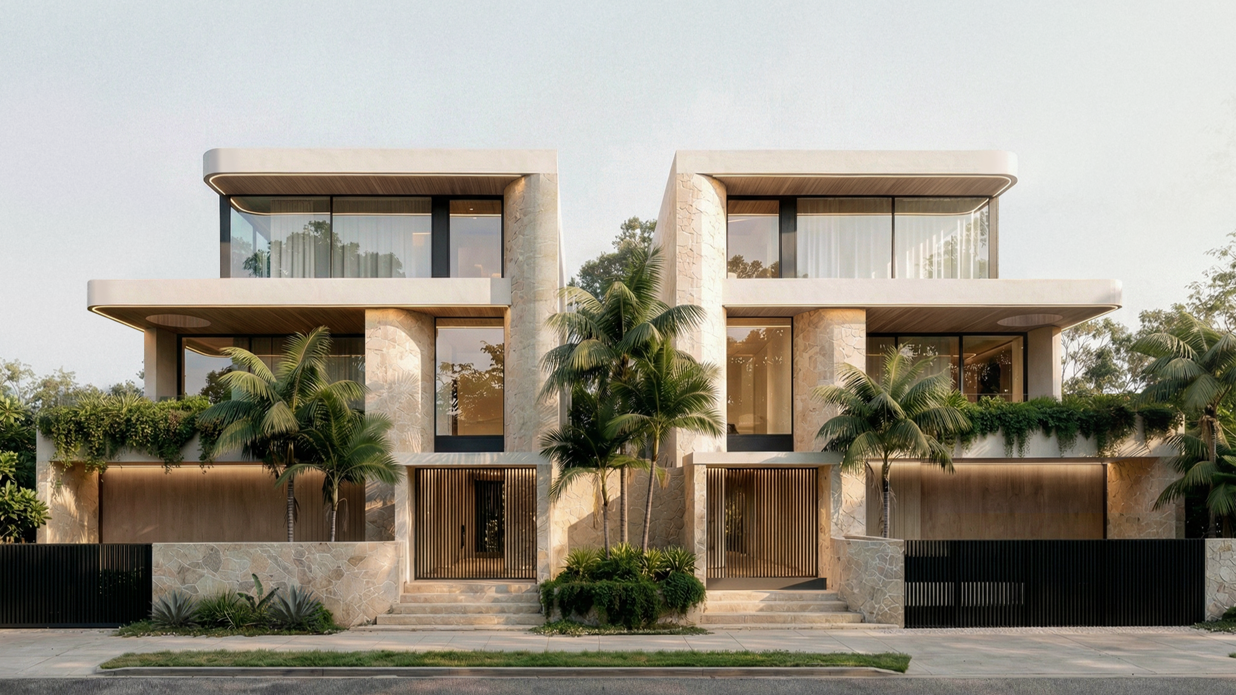 The name “Duet” references the complementary relationship between the two homes. Drawing inspiration from contemporary duplex developments, the design explores how paired residences can strengthen one another architecturally, creating a more cohesive and impactful presence than if they stood alone.